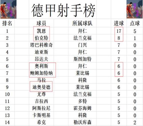 射手榜方面,凱恩上演帽子戲法,讓德甲金靴越來越?jīng)]有懸念,凱恩已經(jīng)比第2的伯克特多了一倍還有剩的。迪亞斯,塔巴科維奇和昂達夫7球并列第3,迪奧曼德帽子戲法,鮑姆加特納傳射建功,兩人追上奧利斯,馬拉,6球并列第6。